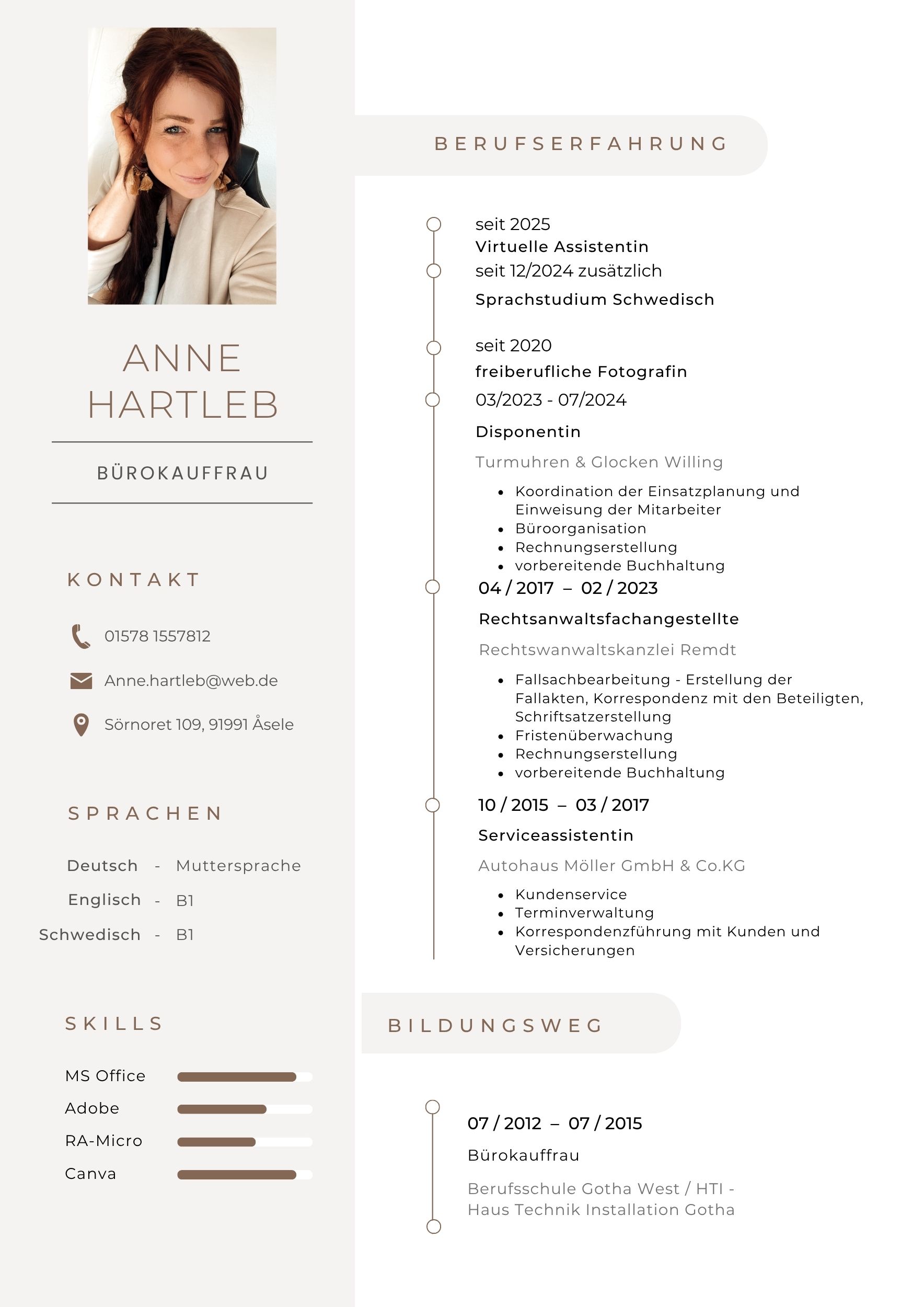 Ich bin Anne – strukturierte und zuverlässige virtuelle Assistentin mit einem kaufmännischen Hintergrund und langjähriger Erfahrung im Büro- und Verwaltungsbereich.