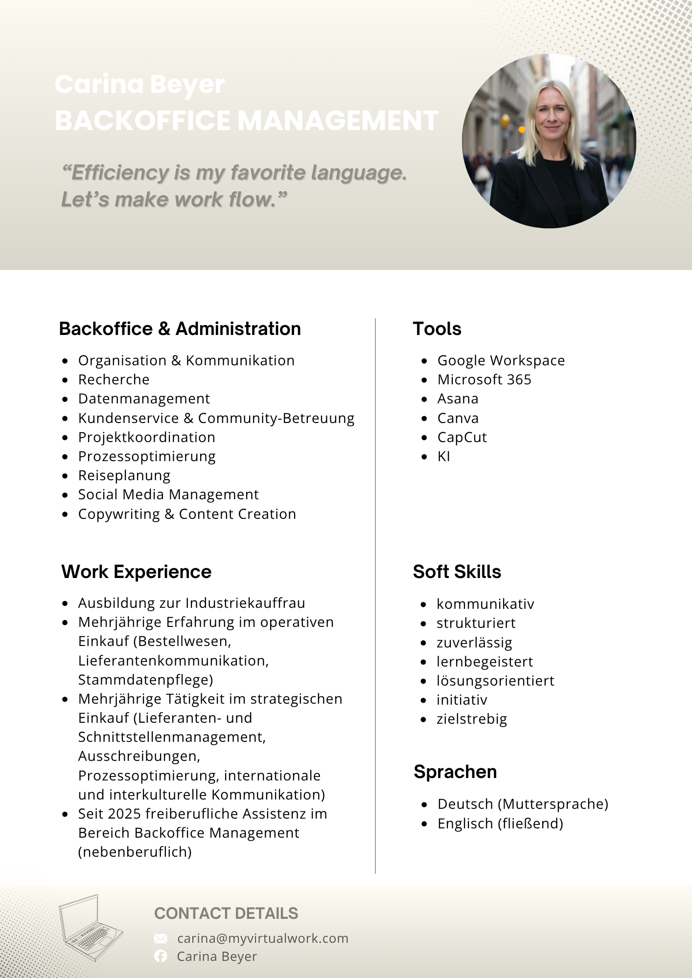 Struktur, Übersicht und Organisation sind meine Stärke. Als ausgebildete Industriekauffrau mit über 10 Jahren Erfahrung im operativen und strategischen Einkauf, weiß ich, wie wichtig strukturierte und klare Abläufe sind. Als Freelancerin unterstütze ich zuverlässig bei organisatorischen und administrativen Aufgaben sowie Projektorganisation und Assistenzthemen. Ob Reiseplanung, E-Mail- und Korrespondenzmanagement, Kundensupport oder Koordination im Tagesgeschäft – mit einem Blick fürs Detail und einem guten Prozessverständnis sorge ich für effiziente Abläufe. Durch meine strukturierte Arbeitsweise, den sicheren Umgang mit digitalen Tools und den gezielten Einsatz von KI helfe ich, Zeit zu sparen, Prozesse zu vereinfachen und Kosten langfristig zu senken. In neue Tools und Themen arbeite ich mich sehr schnell ein und übernehme Verantwortung. Ich arbeite vorausschauend, sorgfältig und mit einem hohen Qualitätsanspruch. Meine Kunden können sich somit auf ihr Kerngeschäft konzentrieren und gewinnen Zeit für strategisch wichtige Aufgaben, was den Unternehmenserfolg langfristig sichert.