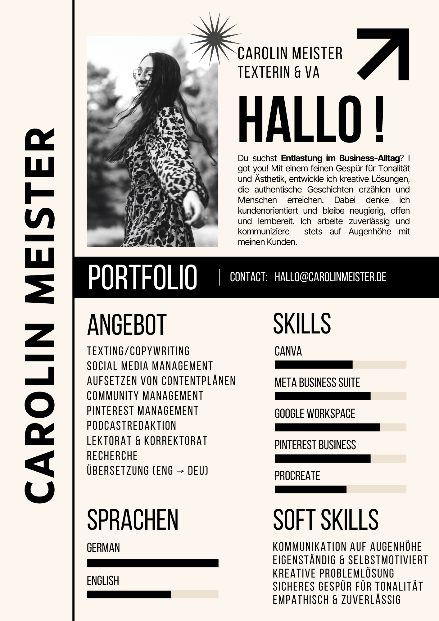 ich bin Carolin – kreative, virtuelle Assistentin für Content, Texte und digitale Projekte. Ich unterstütze Selbstständige, kleine Unternehmen und Herzensprojekte dabei, ihre Ideen sichtbar zu machen und ihre Botschaft klar nach außen zu tragen.