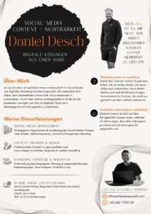Mein Name ist Daniel Desch und ich helfe Marken, Unternehmern und Selbstständigen dabei, eine starke, professionelle und sichtbare Online-Präsenz aufzubauen.