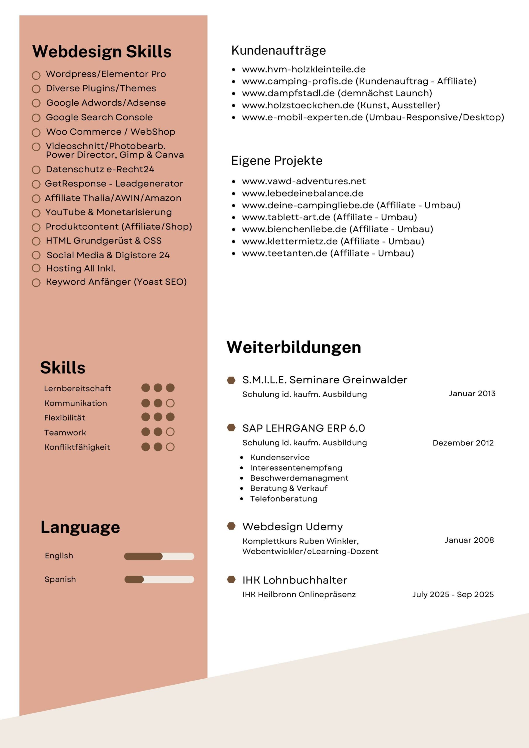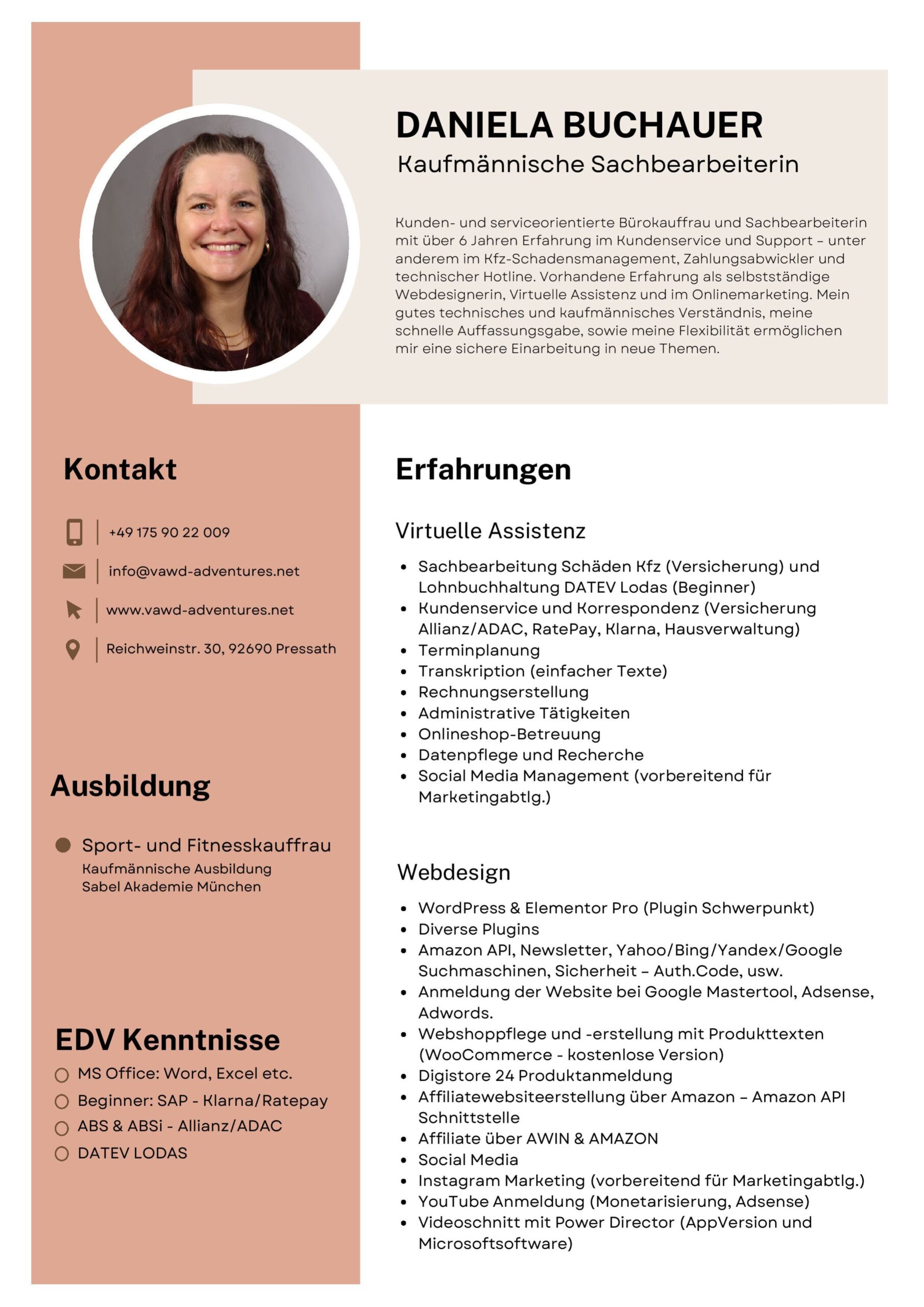 Kunden- und serviceorientierte Bürokauffrau und Sachbearbeiterin mit über 6 Jahren Erfahrung im Kundenservice und Support – unter anderem im Kfz-Schadensmanagement, Zahlungsabwickler und technischer Hotline. Vorhandene Erfahrungen als selbstständige Webdesignerin, Virtuelle Assistenz und im Onlinemarketing. Mein gutes technisches und kaufmännisches Verständnis, meine schnelle Auffassungsgabe, sowie meine Flexibilität ermöglichen mir eine sichere Einarbeitung in neue Themen.