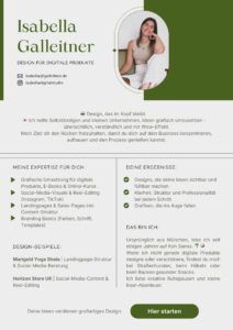 Mir ist wichtig, dass Design nicht nur gut aussieht, sondern Orientierung gibt. Deshalb arbeite ich nicht mit schnellen Canva-Vorlagen, sondern denke mich in Inhalte ein, sortiere, vereinfache und übersetze sie in funktionale Designs. Das Ergebnis sind professionelle Materialien, die Rückfragen reduzieren und Kundinnen sicher durch das Angebot führen.