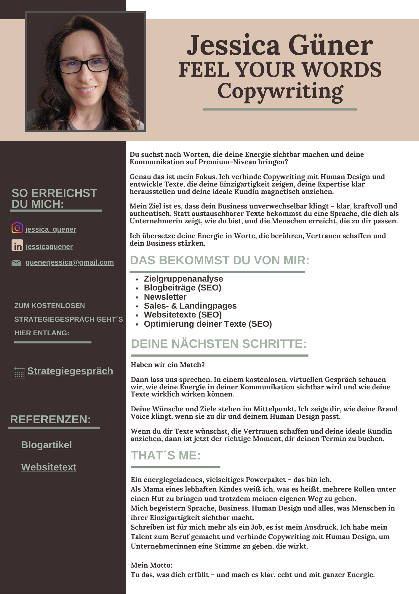 Ich bringe Copywriting und Human Design zusammen. Für selbstständige Frauen entwickle ich eine Sprache, die ihre Einzigartigkeit nicht nur zeigt, sondern ihre Wunschkundinnen magnetisch anzieht.