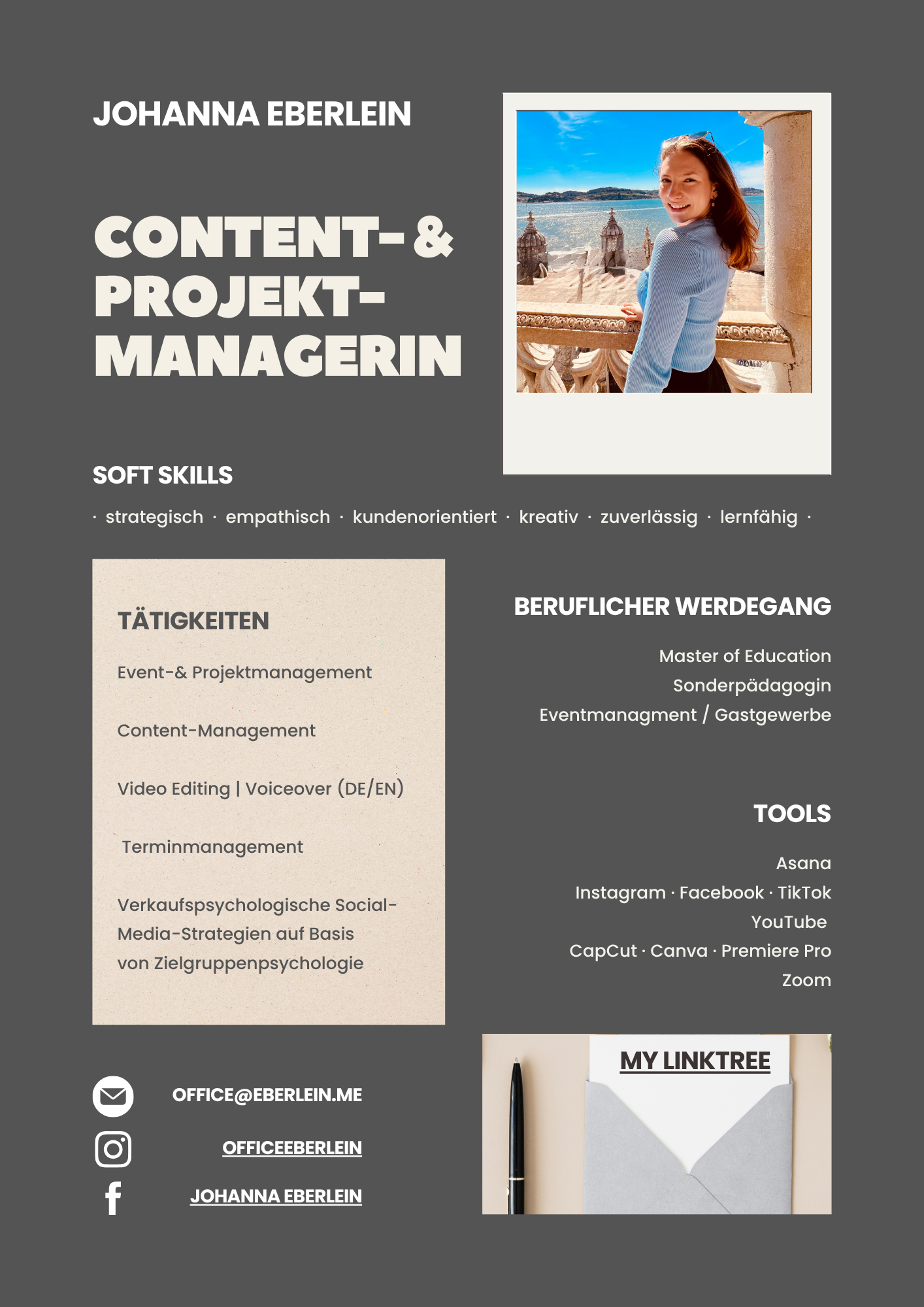- Content & Social Media: Erfahrung in Social-Media-Strategien, Content-Planung, Erstellung von Videos, Reels und Posts, Storytelling und Community-Betreuung
