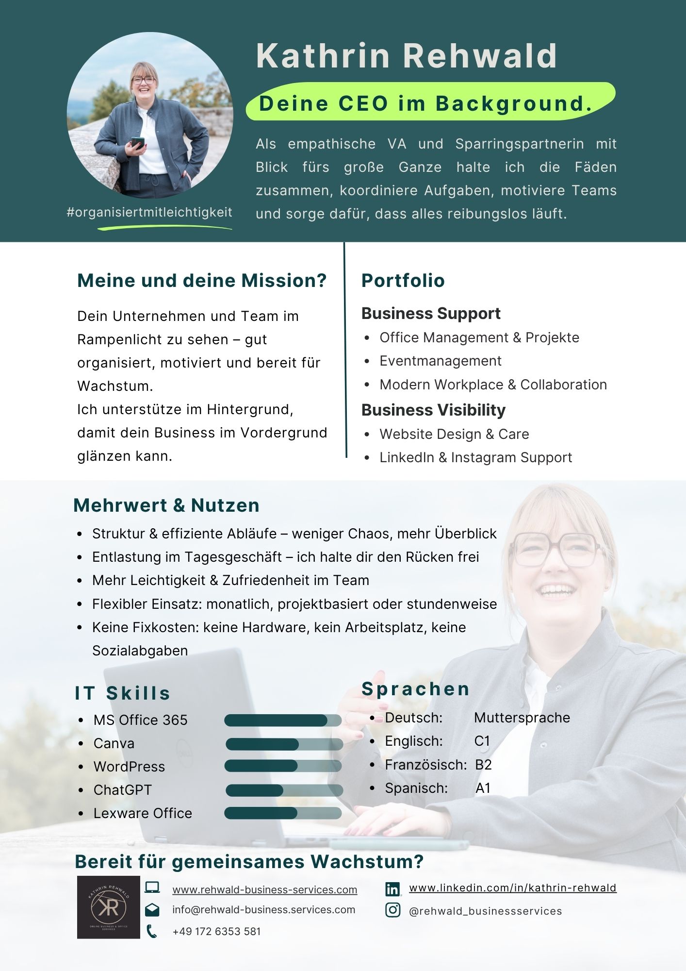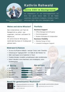 Meine und deine Mission? Dein Unternehmen im Rampenlicht sehen – gut organisiert, motiviert und bereit für Wachstum. Ich manage alles im Hintergrund, damit dein Business im Vordergrund glänzen kann.