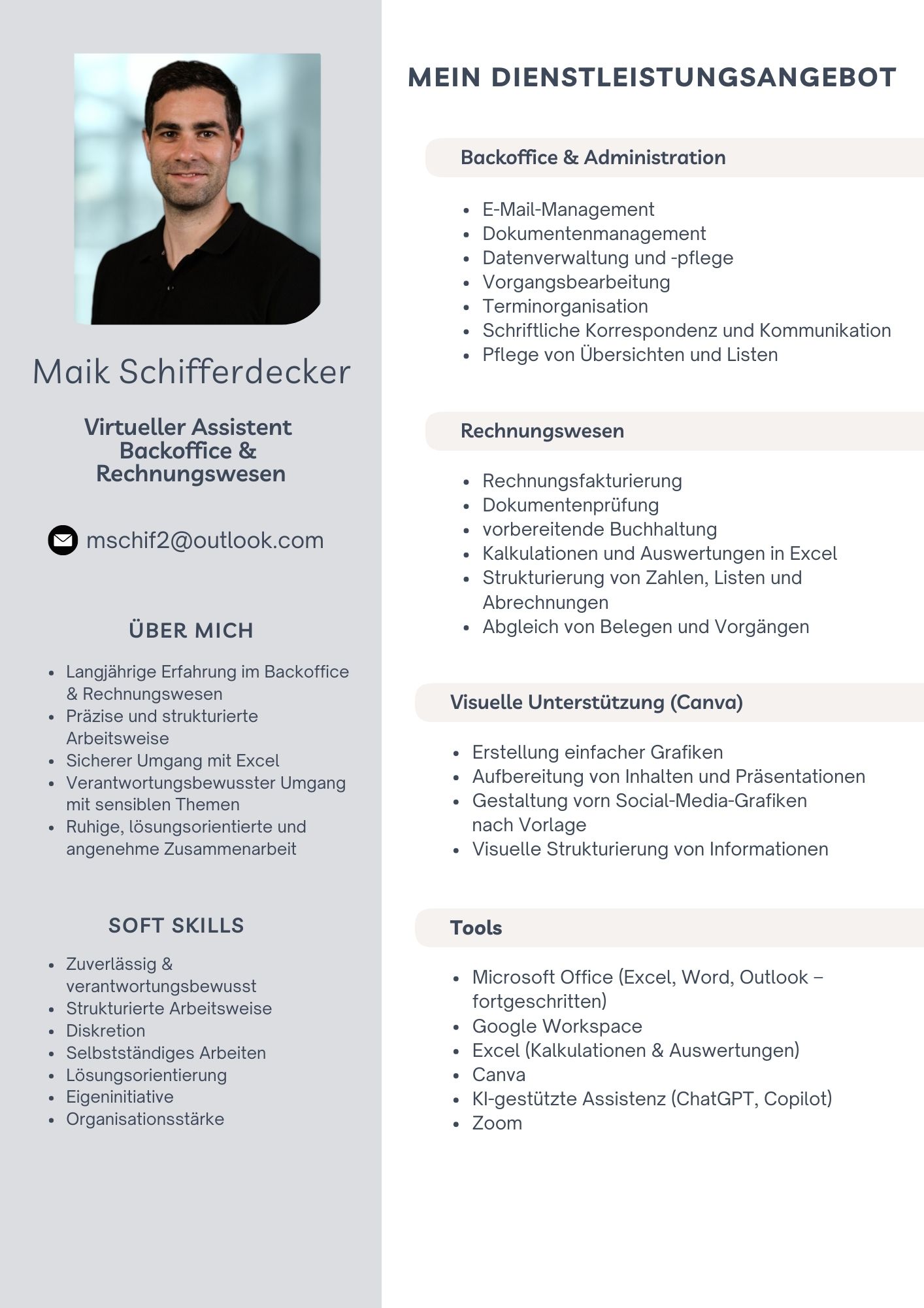 Durch über 15 Jahre Berufserfahrung im Backoffice, Rechnungswesen und in der Prozesskoordination arbeite ich effizient, selbstständig und mit einem hohen Qualitätsanspruch. Ich behalte den Überblick, strukturiere Abläufe und entlaste gezielt im Tagesgeschäft.