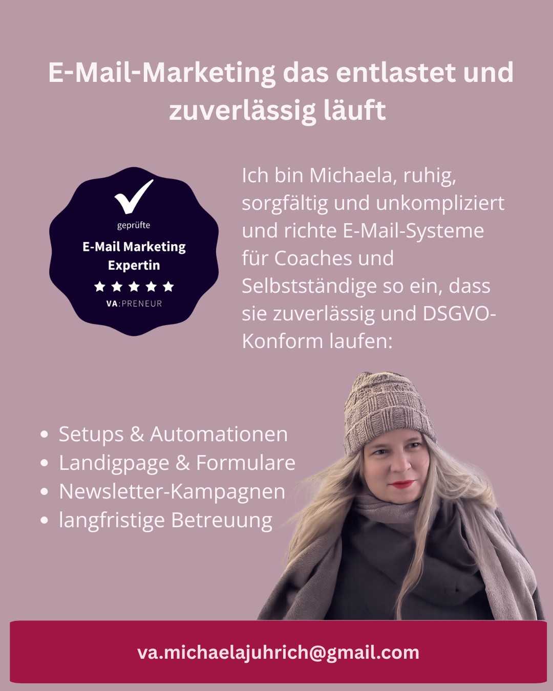 Ich unterstütze Coaches, Unternehmer:innen, Selbstständige dabei, ihr E-Mail Marketing aufzubauen und zu betreuen.