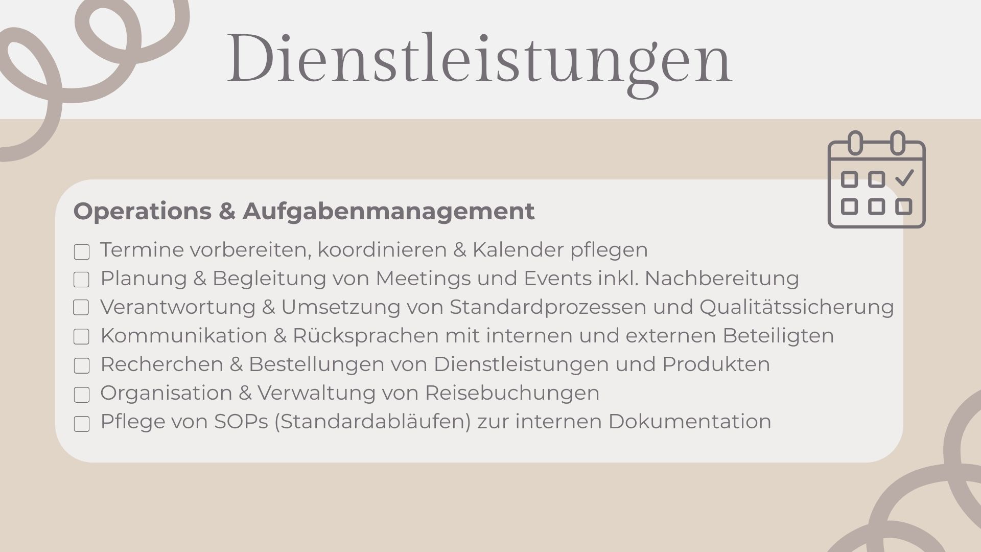 Standardprozesse umsetzen, Qualität sichern, Kalender/Termine managen, Recherche & Orga