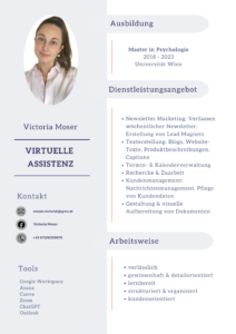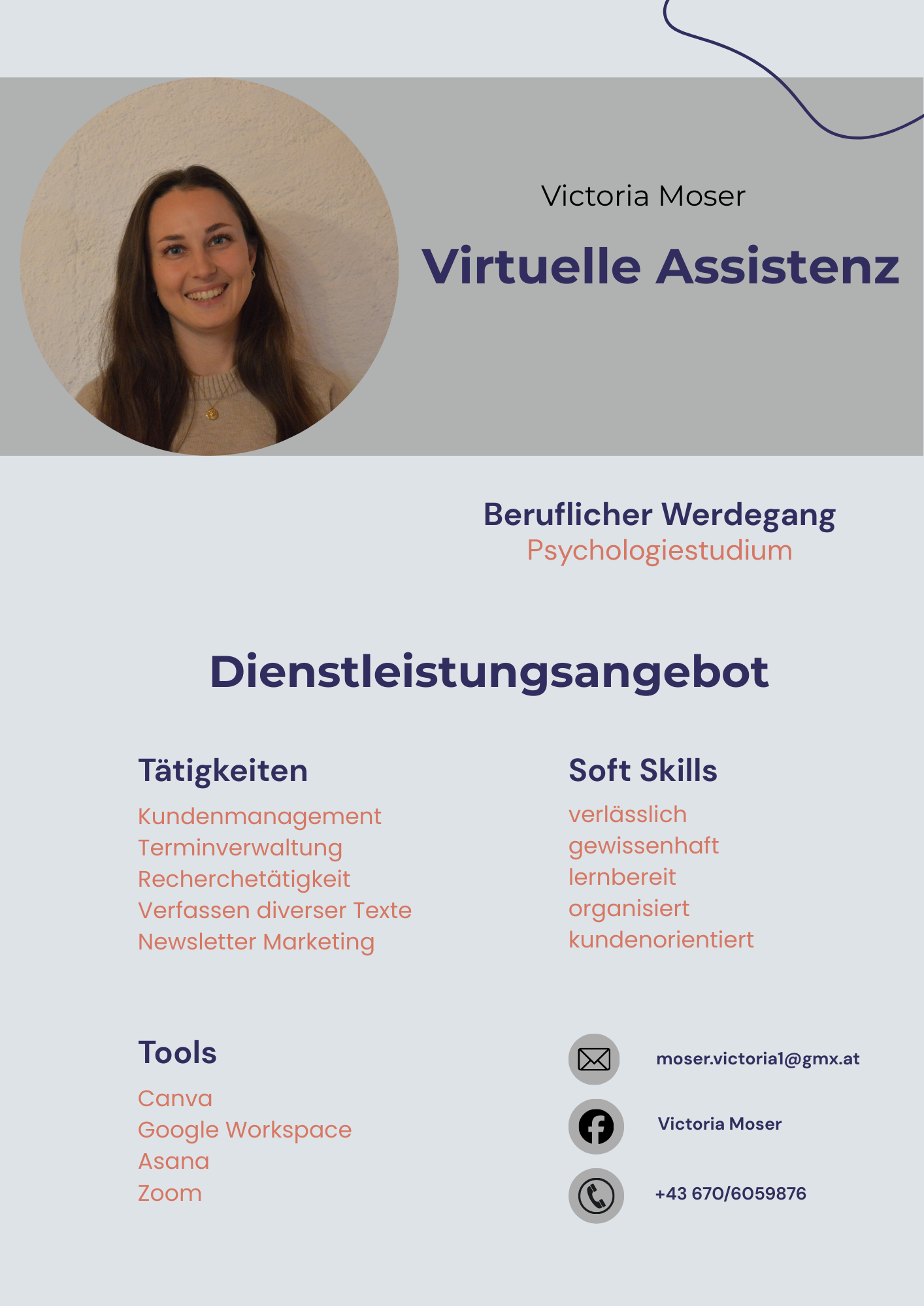 Ich betreue Unternehmen, welche Unterstützung bei verschiedenen Tätigkeiten brauchen, sodass du als Unternehmer mehr Zeit und Ressourcen für die wesentlichen Inhalte deines Business hast. Meine Kompetenzen liegen in folgenden Bereichen: